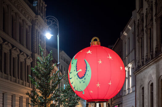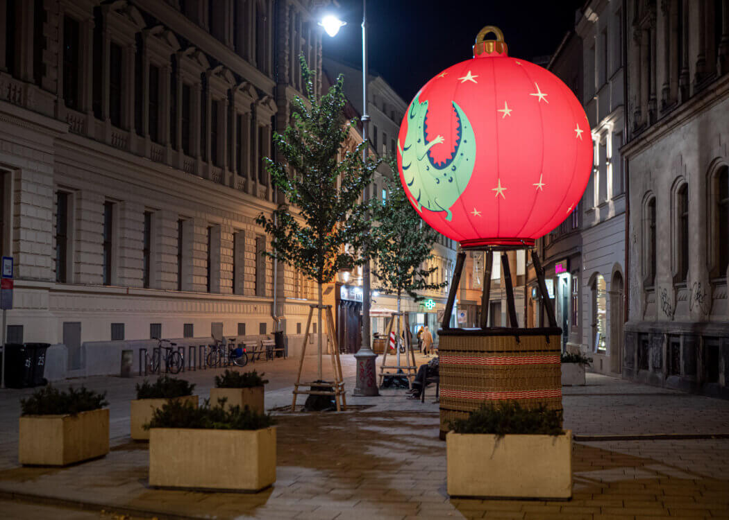 „Čas proletět se nad vánočním Brnem!“ volá rozverný dráček do všech ulic a náměstí a zve vás na snový let. Zastavte se u fotopointu Vánoční baňka na Rašínově ulici a vstupte do koše skutečného horkovzdušného balónu. I když se nevznesete do oblak, můžete se ve svých představách při vyfocení v něm stát alespoň na chvíli vzduchoplavcem jako pilot horkovzdušného balónu. Autentický pletený koš pochází z dílny Kubíček Balloons a nese barvy města Brna. Doplňuje jej nafukovací balón ve tvaru vánoční baňky s motivem brněnského draka od Kubíček Visionair.