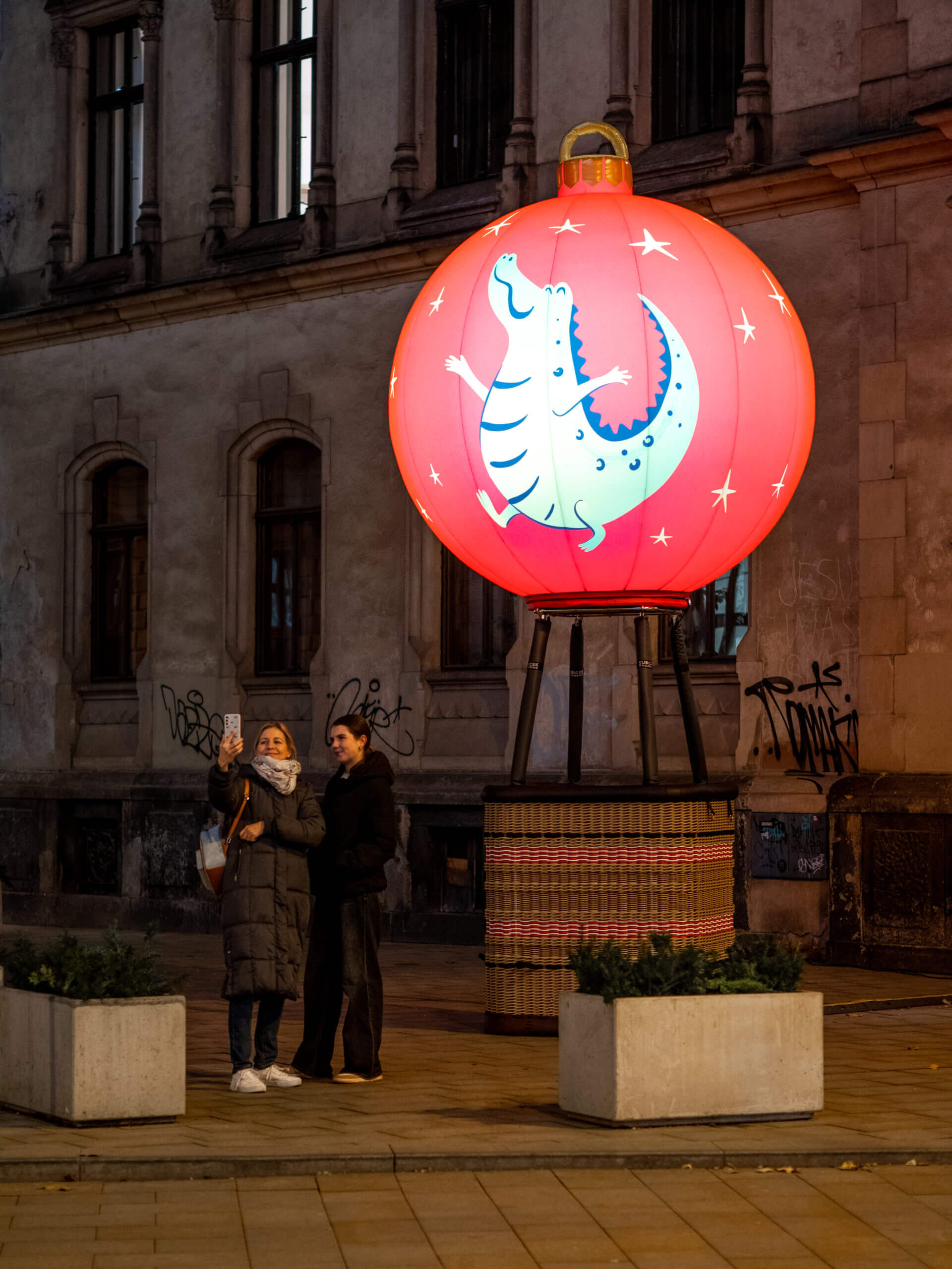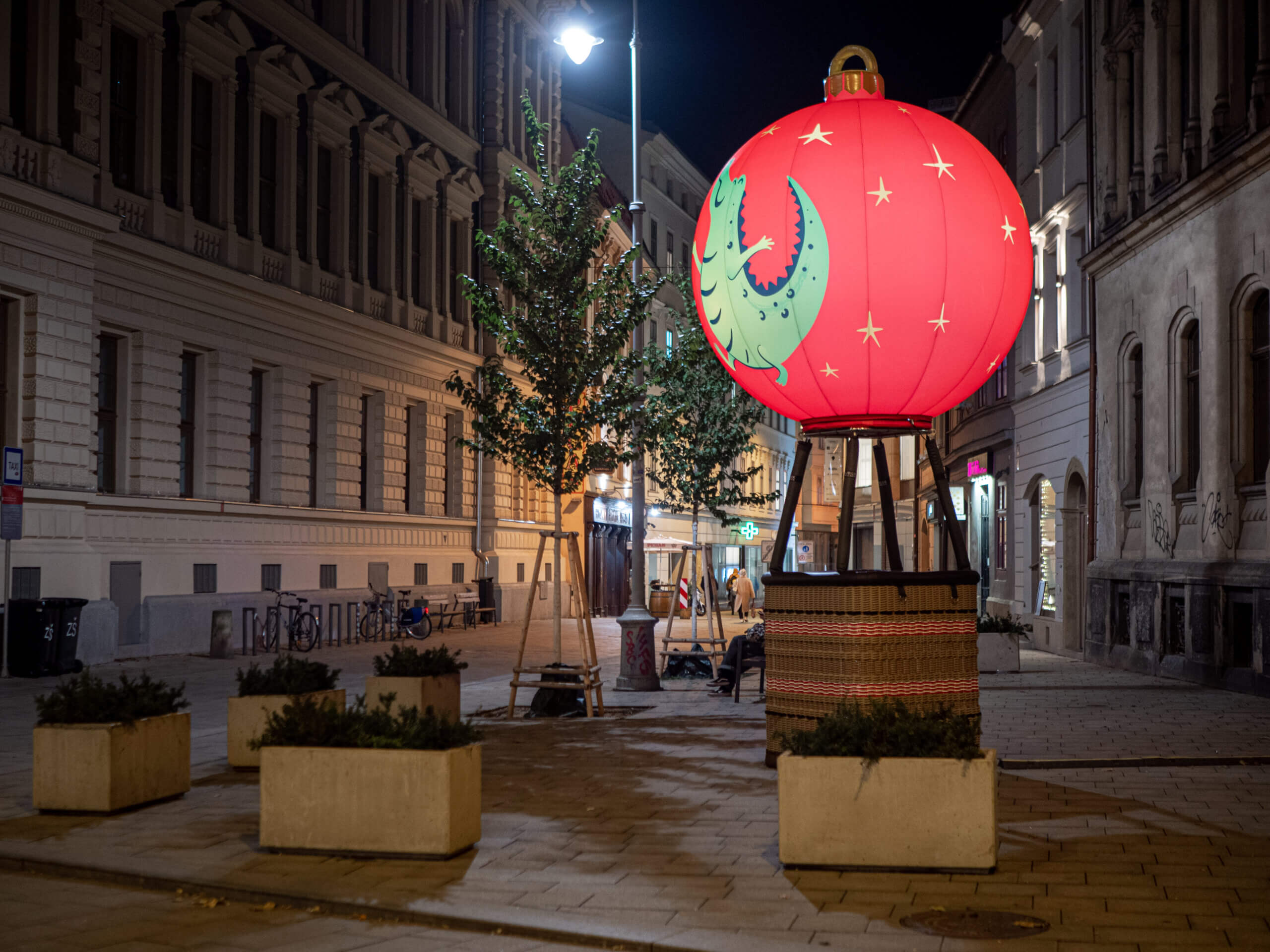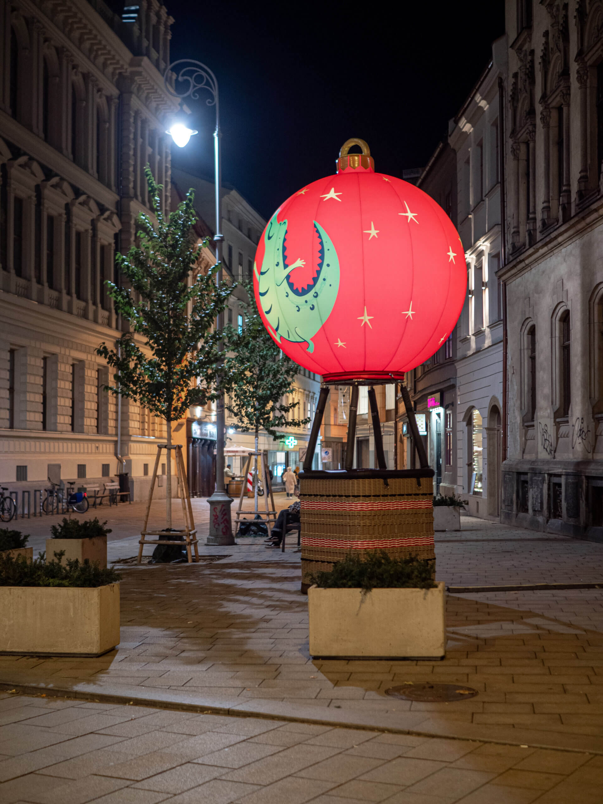 „Čas proletět se nad vánočním Brnem!“ volá rozverný dráček do všech ulic a náměstí a zve vás na snový let. Zastavte se u fotopointu Vánoční baňka na Rašínově ulici a vstupte do koše skutečného horkovzdušného balónu. I když se nevznesete do oblak, můžete se ve svých představách při vyfocení v něm stát alespoň na chvíli vzduchoplavcem jako pilot horkovzdušného balónu. Autentický pletený koš pochází z dílny Kubíček Balloons a nese barvy města Brna. Doplňuje jej nafukovací balón ve tvaru vánoční baňky s motivem brněnského draka od Kubíček Visionair.