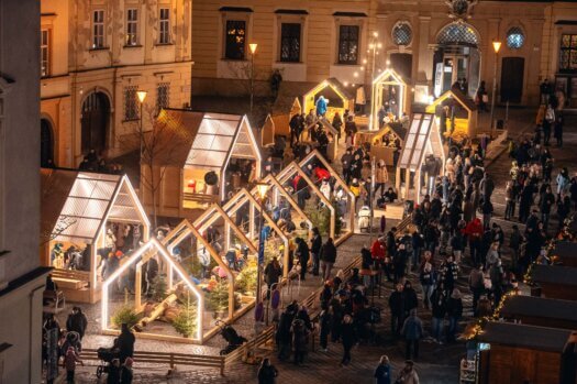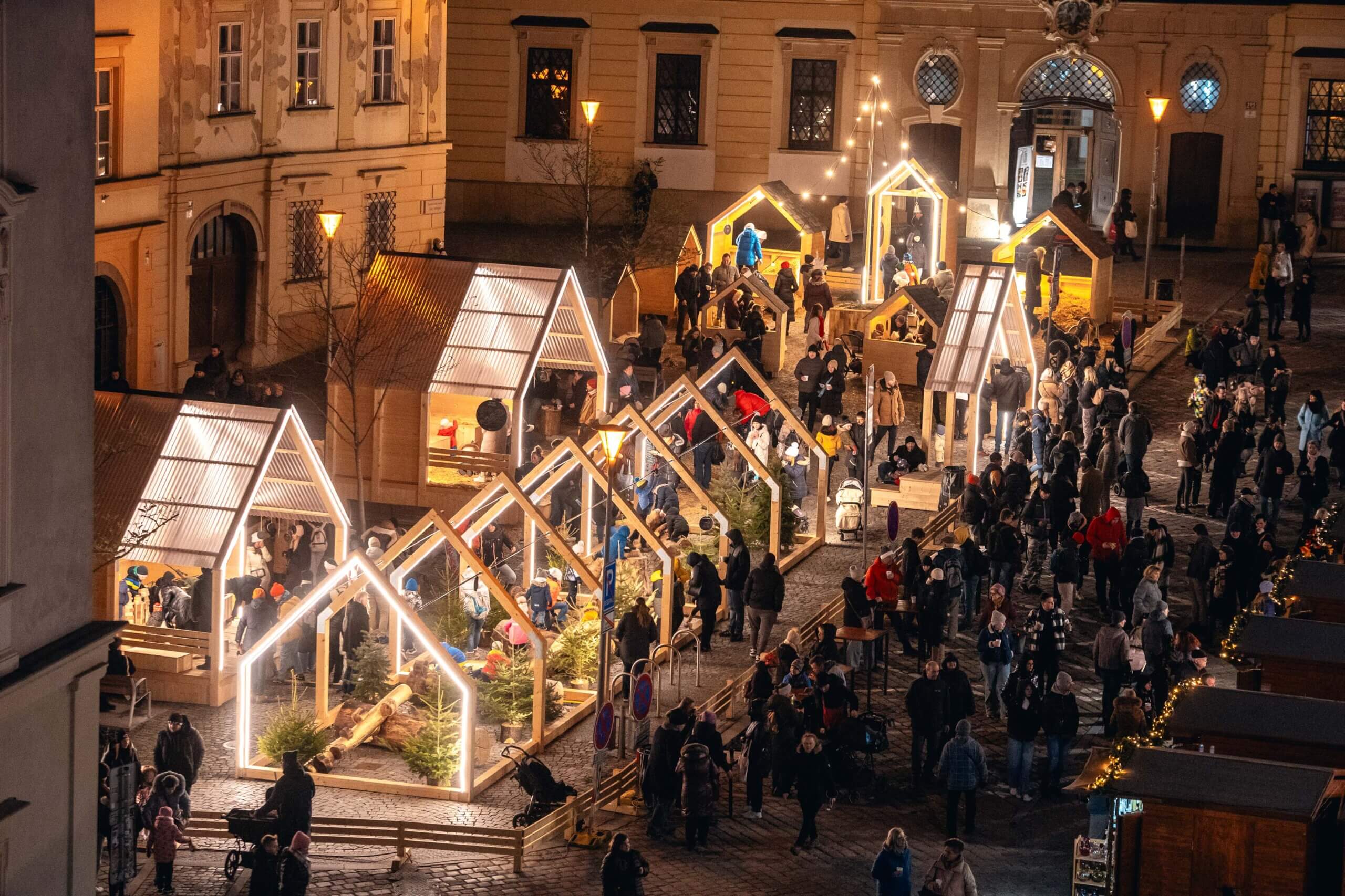 The Children’s Village is an ideal place for the youngest visitors to the Christmas markets. Here, they will find an authentic children’s market with wooden stalls. The village’s atmosphere is enhanced by straw, coniferous trees and large gilded logs that can be used for playing and relaxing on. In a traditional barn, children can build towers or entire cities out of wooden blocks and test their balance on wooden structures and logs. Children’s imaginations can run wild here. The village also features a bell tower with a wishing bell. While the village provides children with space to play, be creative, and have fun, it offers adults peace and relaxation. There is plenty of seating away from the hustle and bustle of the Vegetable Market’s (Zelný trh) central area. Admission to the village is free.