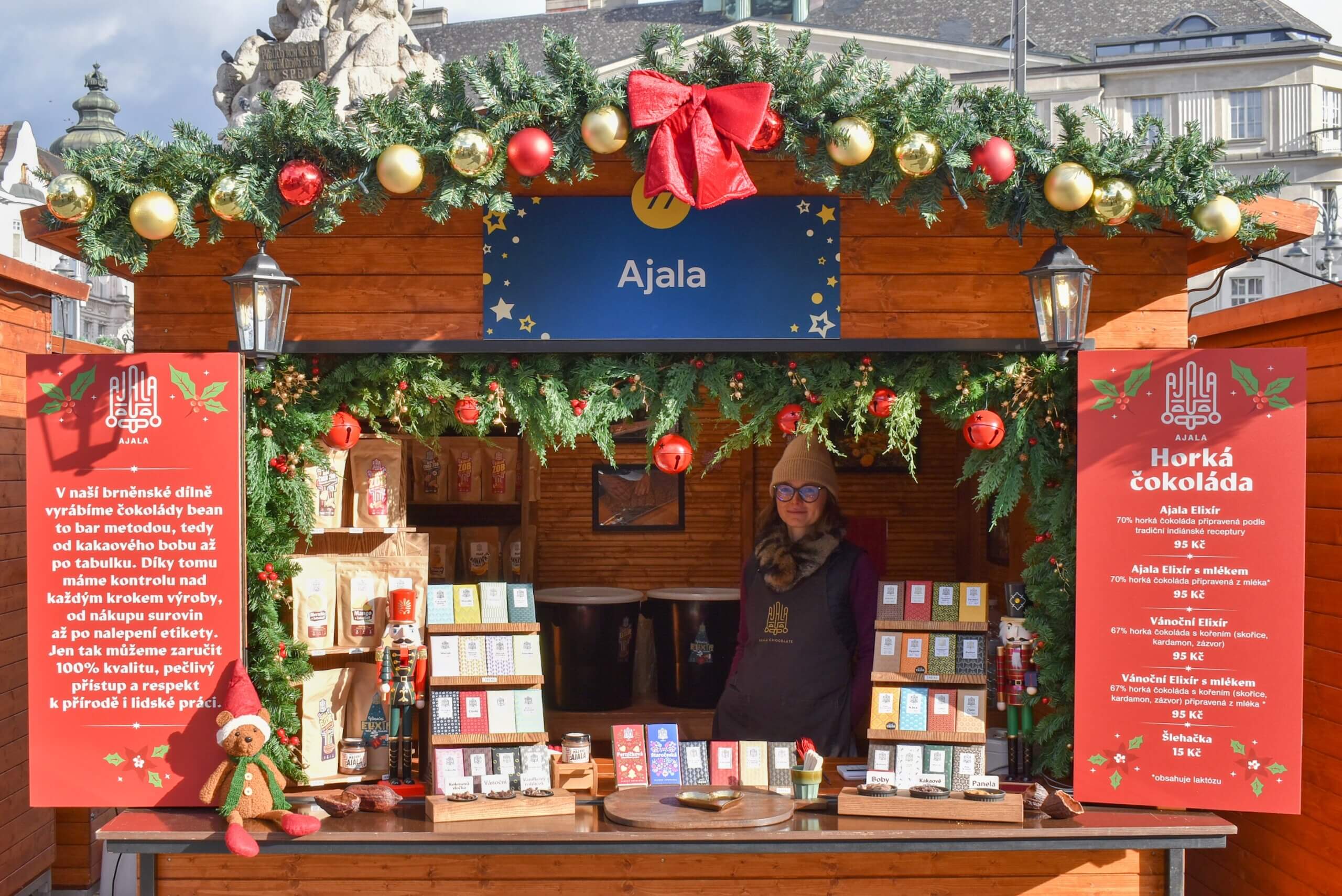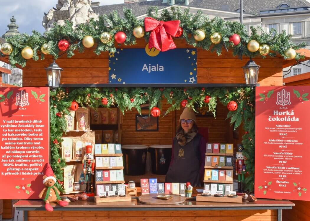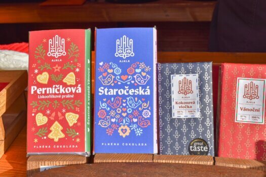 Čokoládové výrobky. Vlastní čokoládové tabulky včetně speciálních vánočních příchutí, horká čokoláda včetně balení na domácí přípravu horkého nápoje (s vodou, rostlinným mlékem, rumem, Baileys), jahody a oříšky máčené v čokoládě. Možnost dárkového balení.