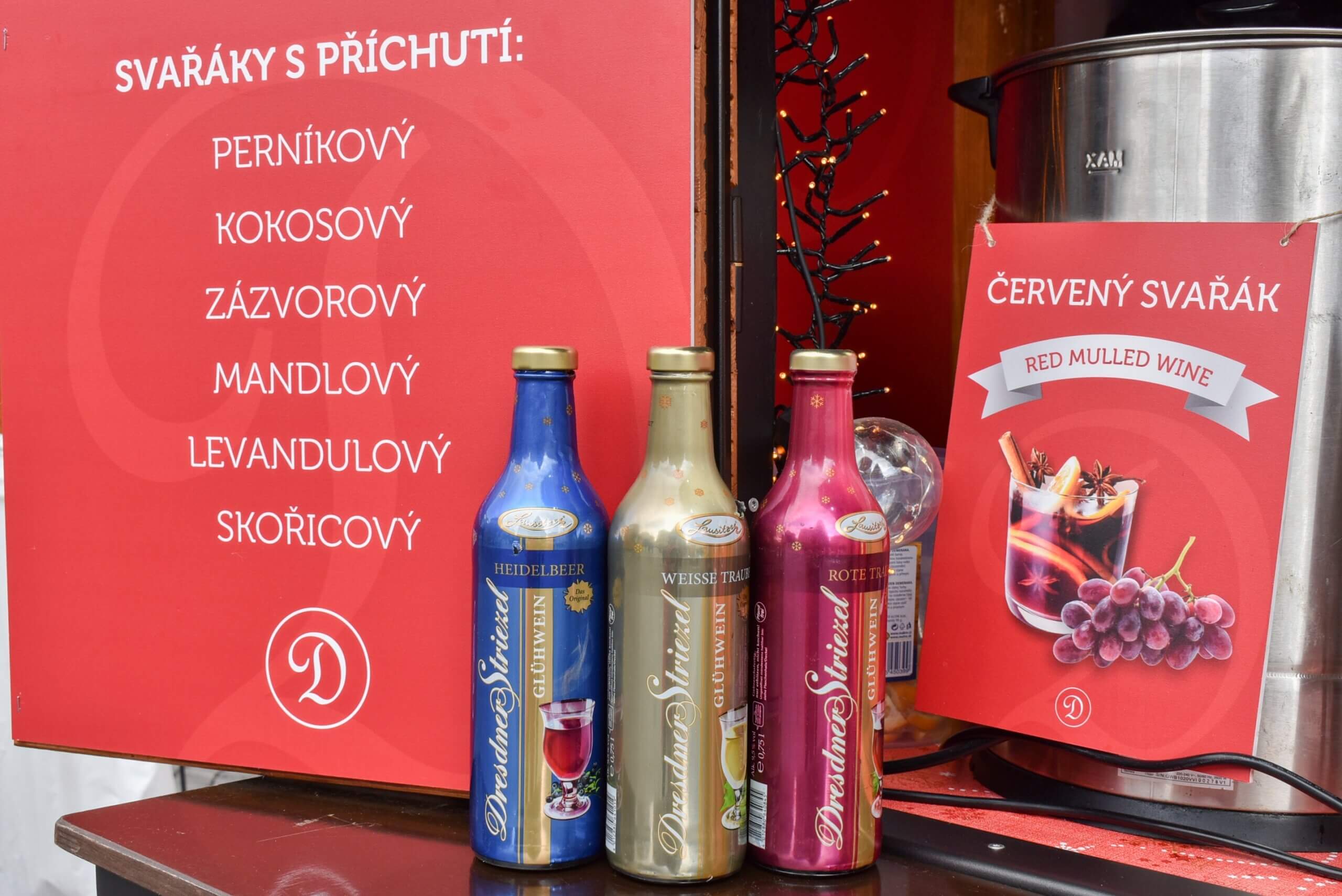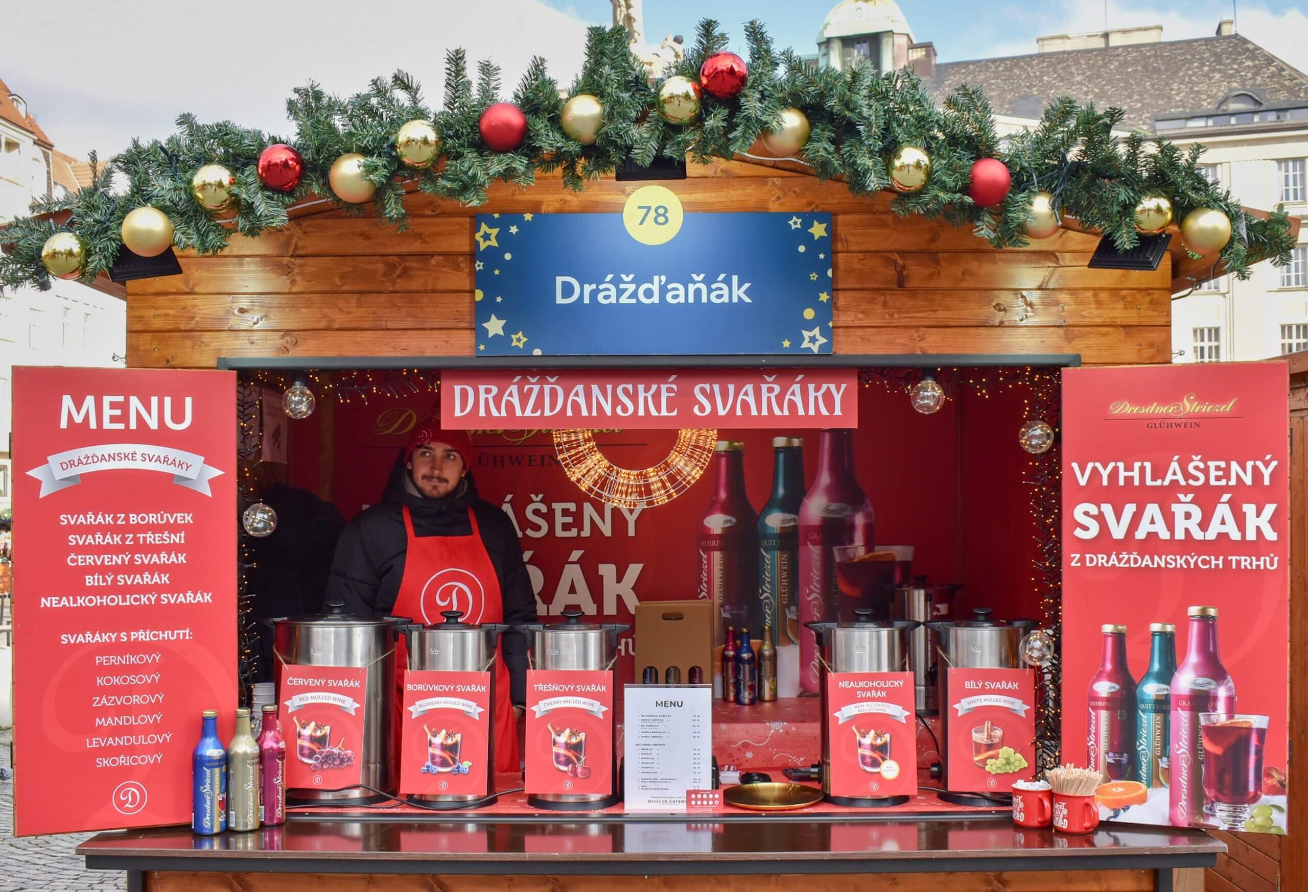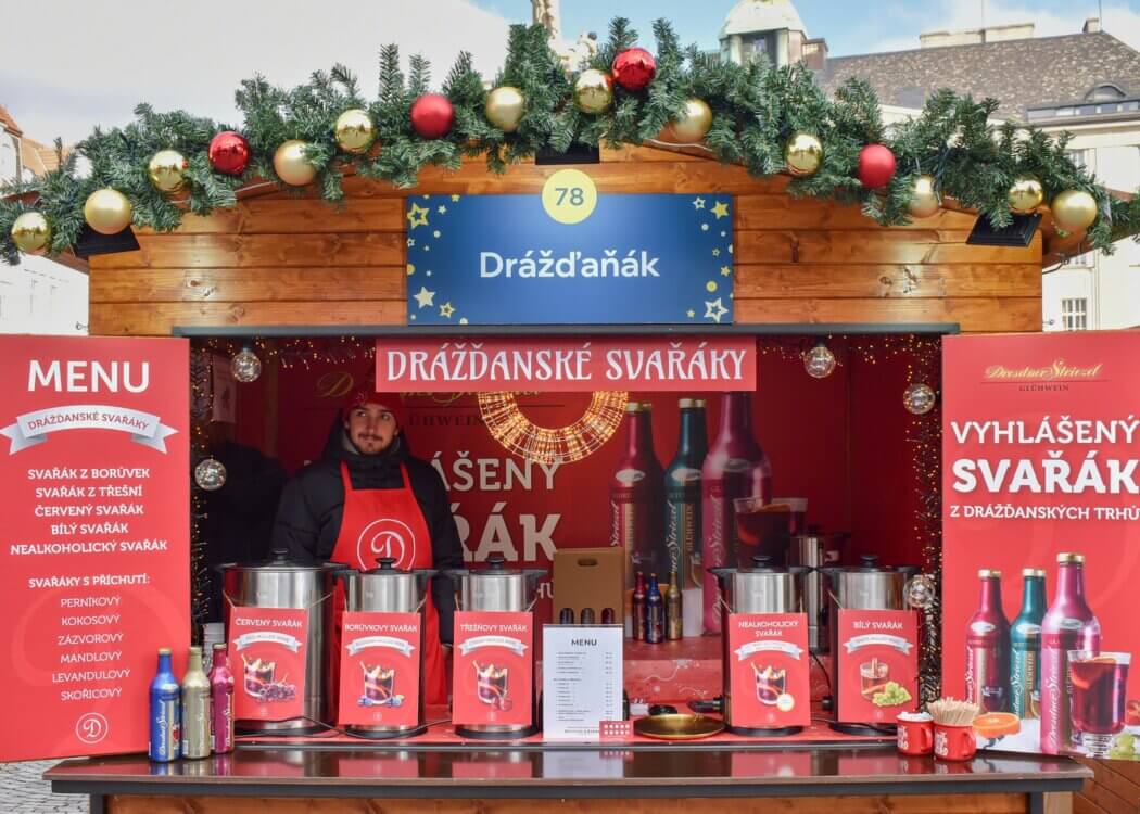 Svařená vína originálních příchutí, jako například: svařené víno z borůvek, svařené víno z třešní, červené a bíle svařené víno, nealkoholické svařené víno a mnoho dalších. 78DrážďaňákZelný trh