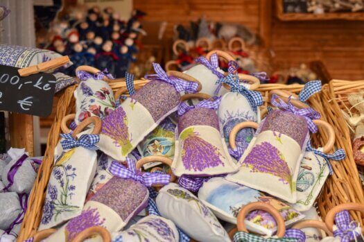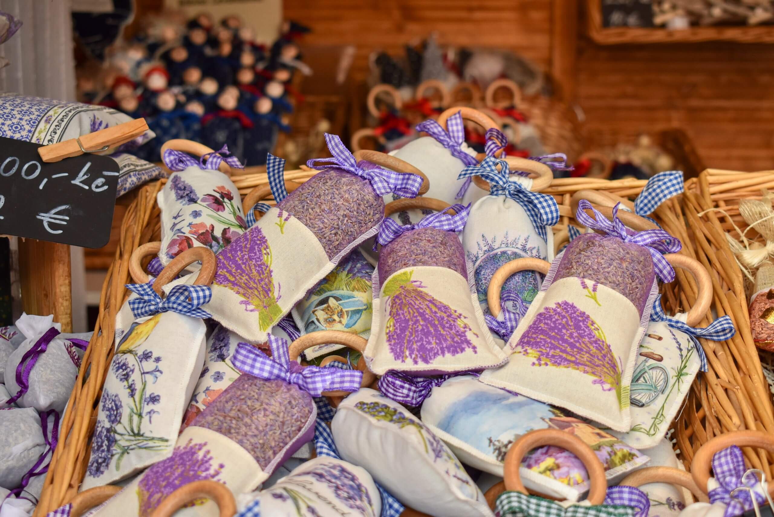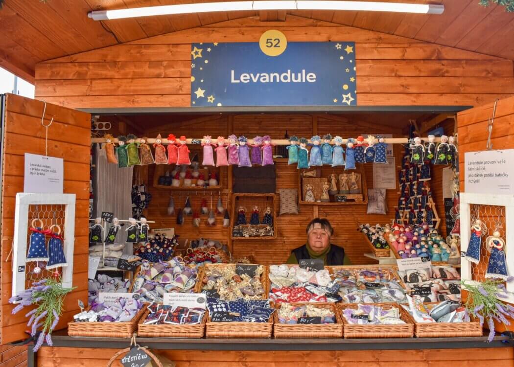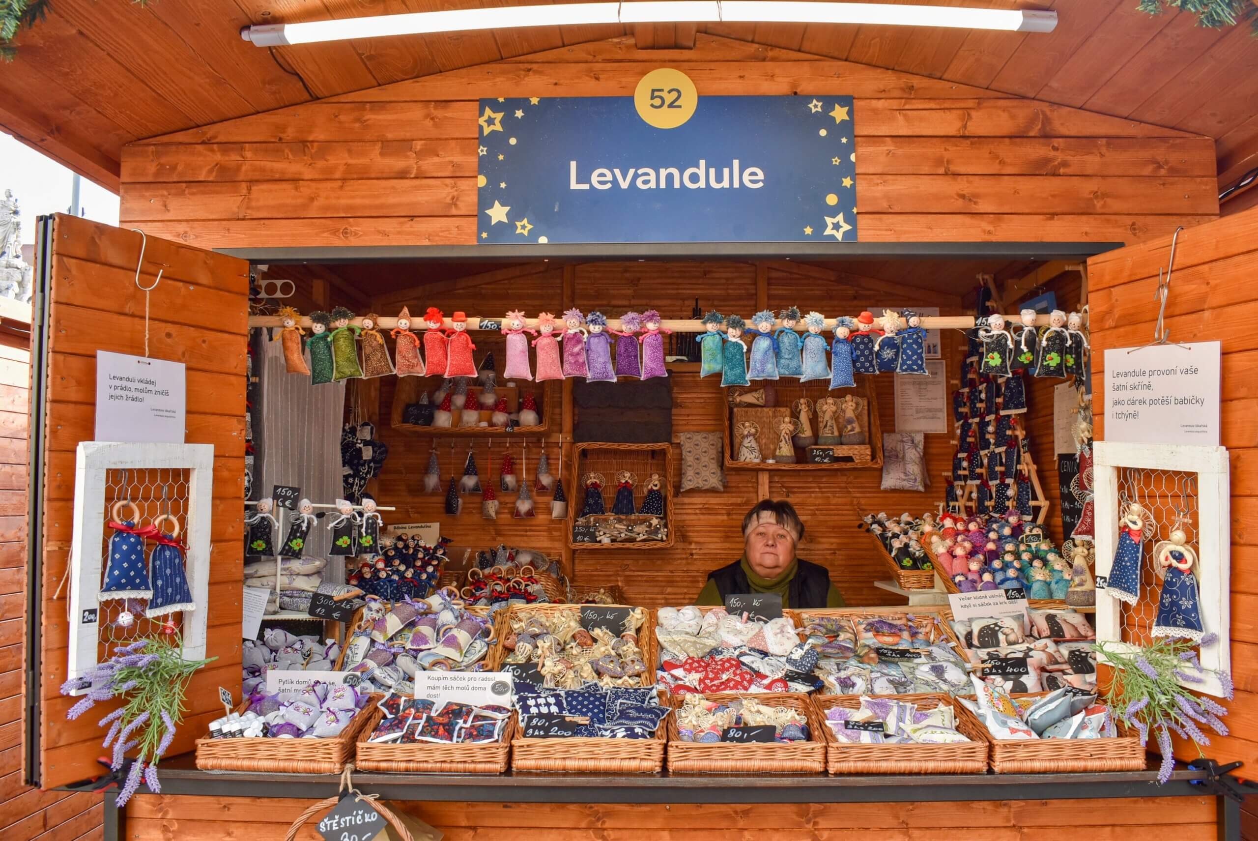 Výrobky z modrotisku a bavlněných látek plněné levandulovým květem (andílci, kominíci, zvonečky, pytlíky, polštářky, srdíčka, panenky atd). 52LevanduleZelný trh