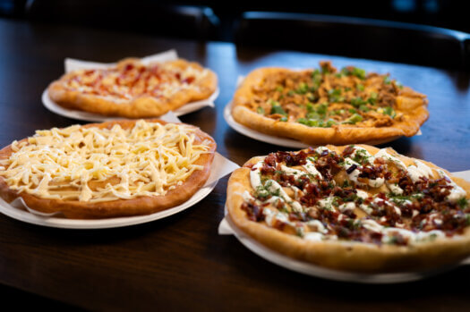 Langoš s trhaným vepřovým masem, čedarová omáčka, jarní cibulka