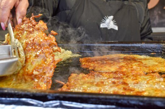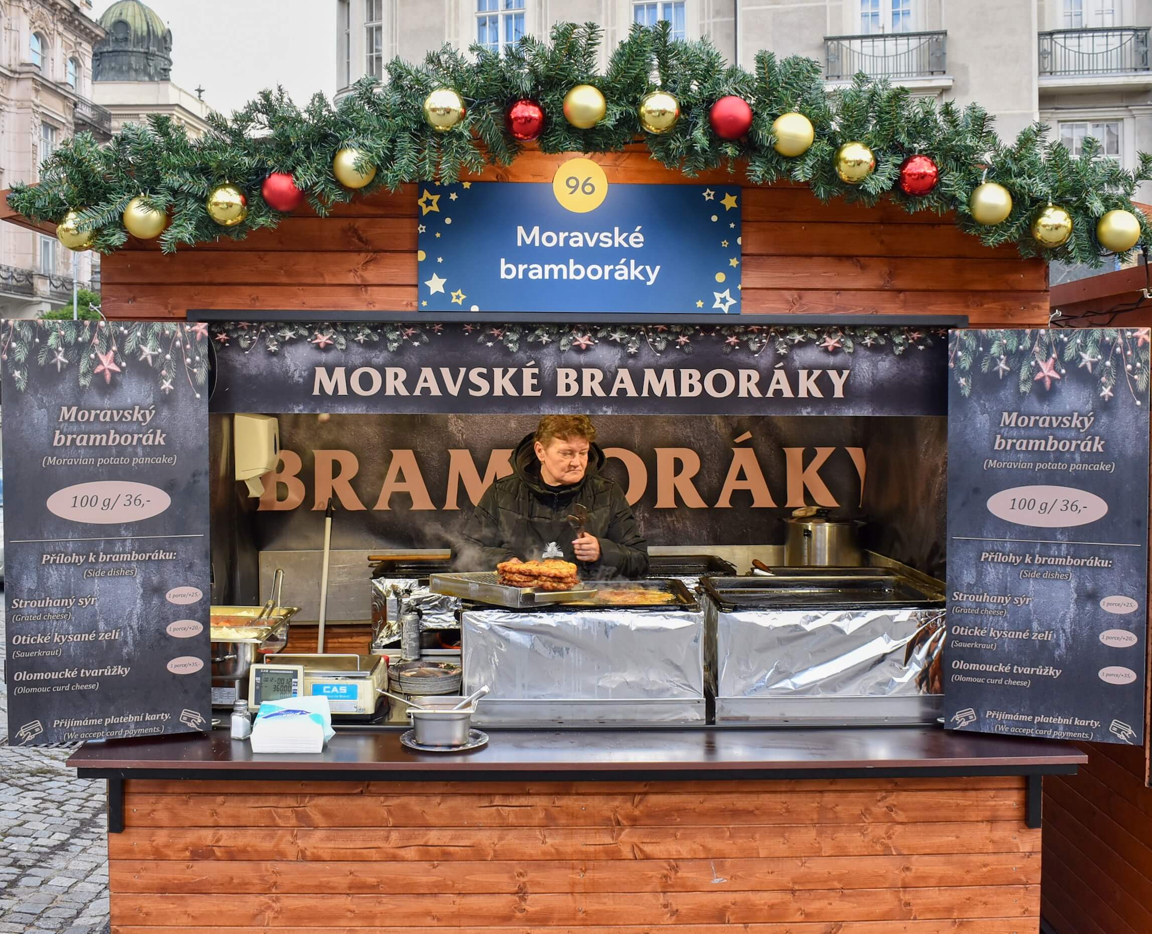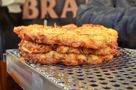 Moravské bramboráky připravované z čerstvého těsta dle tradiční receptury, farmářské brambory s domácí klobáskou a opraženou cibulkou.